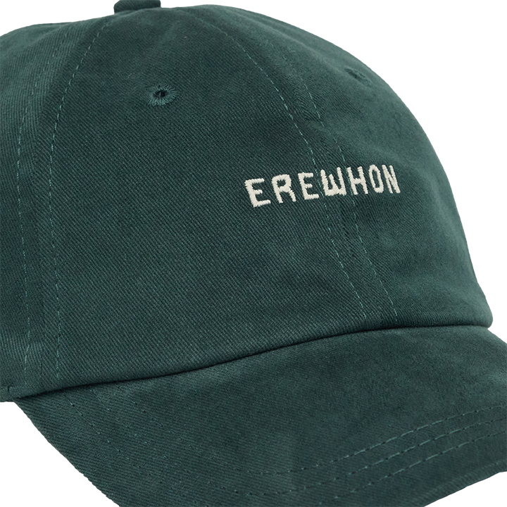 The Erewhon dad hat in green is designed for all-day wearing. Made from a brushed cotton twill it features a logo on the front, a curved brim, and an adjustable closure for all-day wearing.