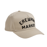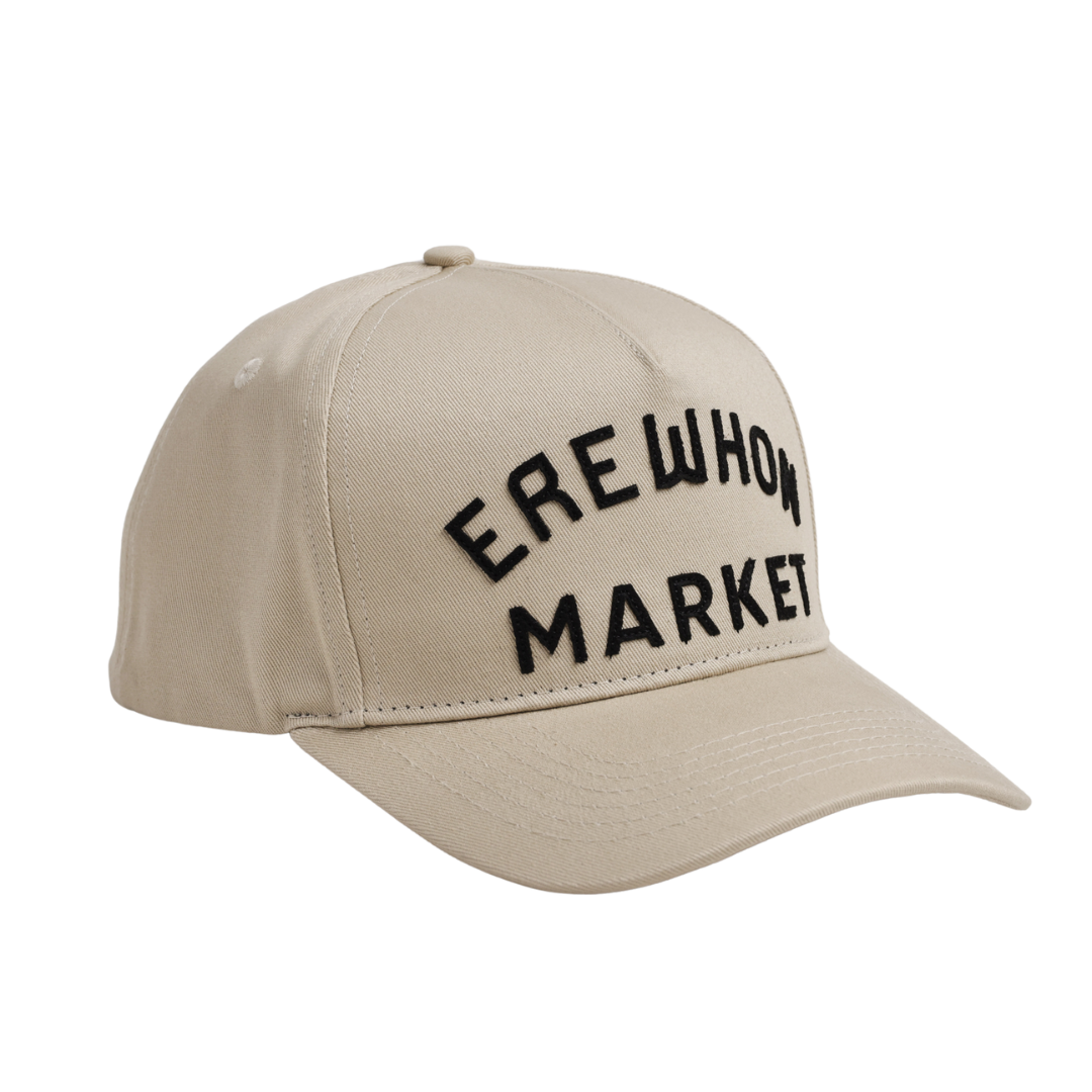A cream-colored baseball cap with 'EREWHON MARKET' text embroidered on the front.