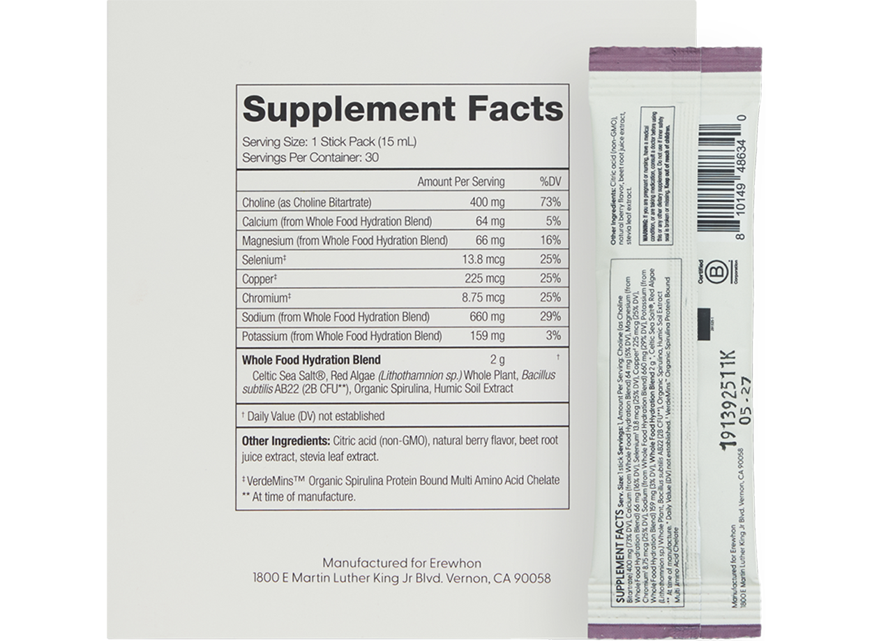 Ingredients: Choline (as Choline Bitartrate), Calcium (from Whole Food Hydration Blend), Magnesium (from Whole Food Hydration Blend), Selenium, Copper, Chromium, Sodium (from Whole Food Hydration Blend), Potassium (from Whole Food Hydration Blend), Whole Food Hydration Blend (Celtic Sea Salt®, Red Algae Whole Plant, Bacillus subtilis AB22 [2 Billion CFU], Organic Spirulina, Humic Soil Extract, Other Ingredients: Citric Acid, Natural Berry Flavor, Beet Root Juice Extract (for color), Stevia Leaf Extract
