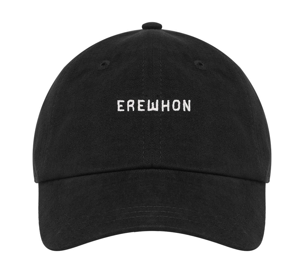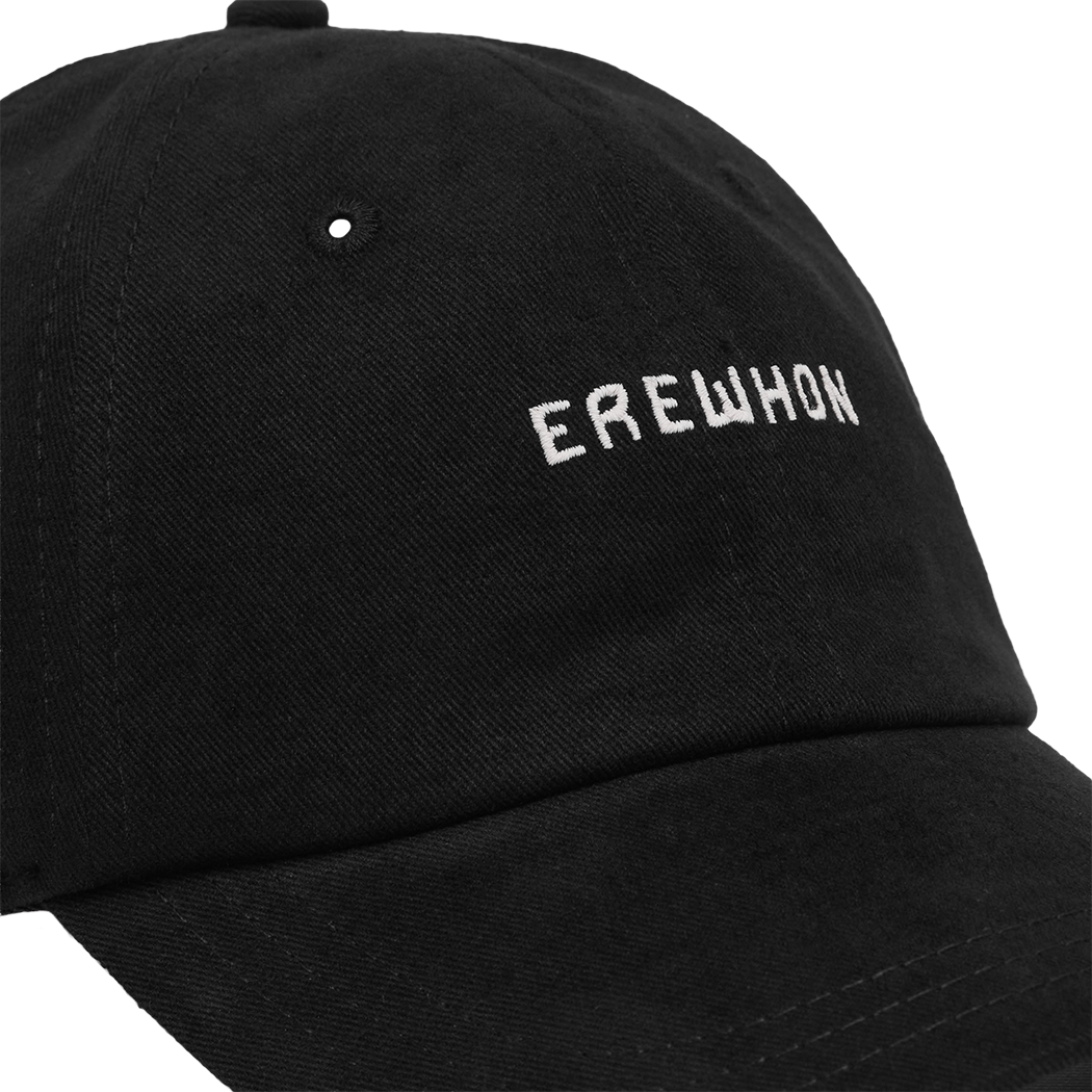 The Erewhon dad hat in black is designed for all-day wearing. Made from a brushed cotton twill it features a logo on the front, a curved brim, and an adjustable closure for all-day wearing.
