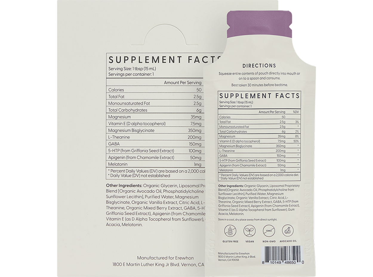 Ingredients: Magnesium Bisglycinate, L-Theanine, GABA, 5-HTP (from Griffonia Seed Extract), Apigenin (from Chamomile Extract), Melatonin, Other Ingredients: Organic Glycerin, Liposomal Proprietary Blend [Organic Avocado Oil, Phosphatidylcholine from Sunflower Lecithin], Purified Water, Organic Vanilla Extract, Citric Acid, Organic Mixed Berry Extract, Gum Acacia