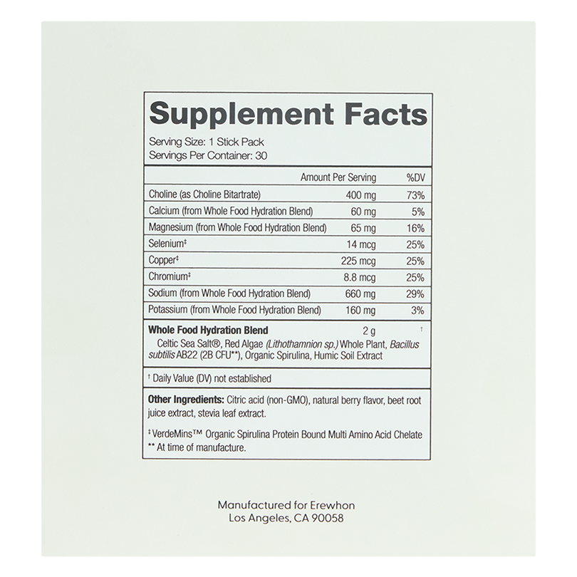 Ingredients: Choline (as Choline Bitartrate), Calcium (from Whole Food Hydration Blend), Magnesium (from Whole Food Hydration Blend), Selenium, Copper, Chromium, Sodium (from Whole Food Hydration Blend), Potassium (from Whole Food Hydration Blend), Whole Food Hydration Blend (Celtic Sea Salt®, Red Algae Whole Plant, Bacillus subtilis AB22 [2 Billion CFU], Organic Spirulina, Humic Soil Extract, Other Ingredients: Citric Acid, Natural Berry Flavor, Beet Root Juice Extract (for color), Stevia Leaf Extract